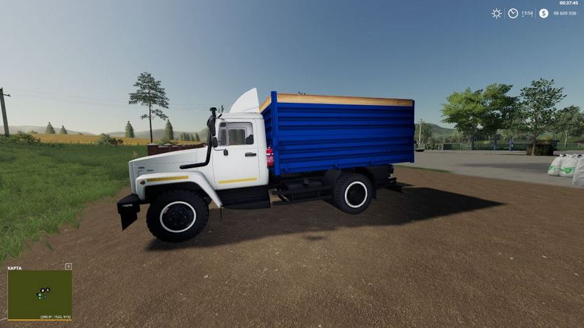 ГАЗ-35071 и САЗ-83173 в FS 2019 снабжены динамическими шлангами. Разгрузка осуществляется на 3 стороны. Подвеска реалистичная, анимации мостов нет, но под грузом проседает. Перевозит стандартные грузы, функционирует с силосным комбайном. Динамические брызговики только на прицепе. Звук переключения скоростей. Пачкаются только колеса. Есть функциональные зеркала, но мутноватые.