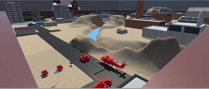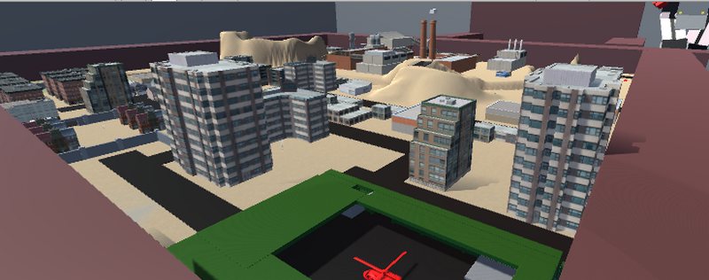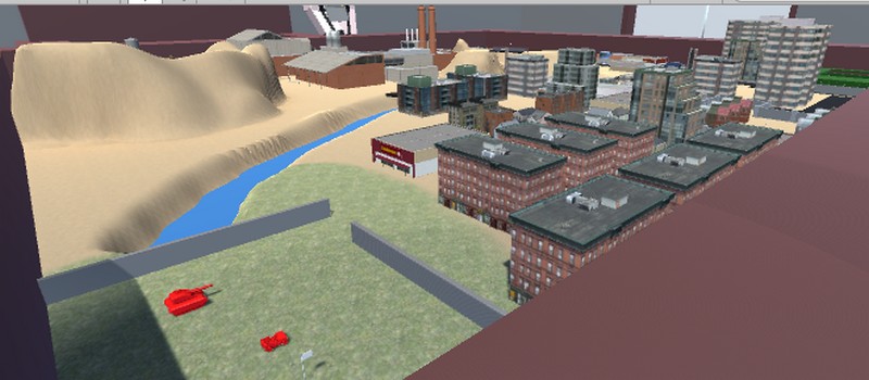 Качественная, хорошо прорисованная городская карта 桌游(舰B警告)для боевых сражений в игре Ravenfield на городских улочках между высотными зданиями и песочной насыпью.